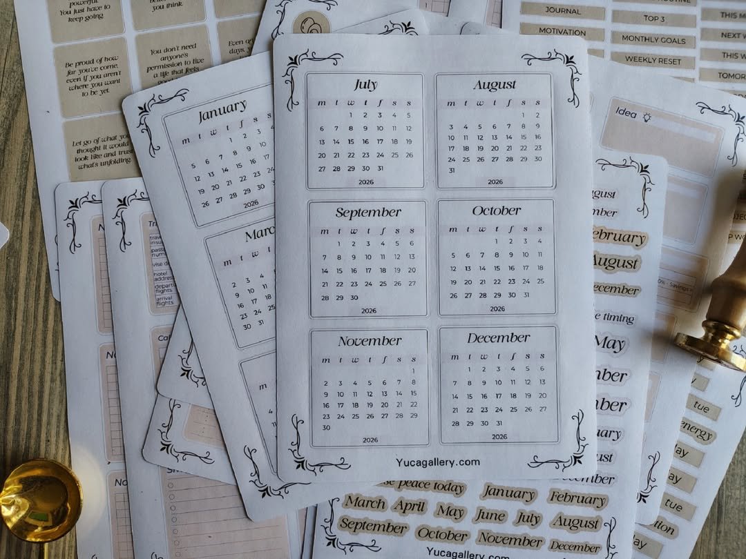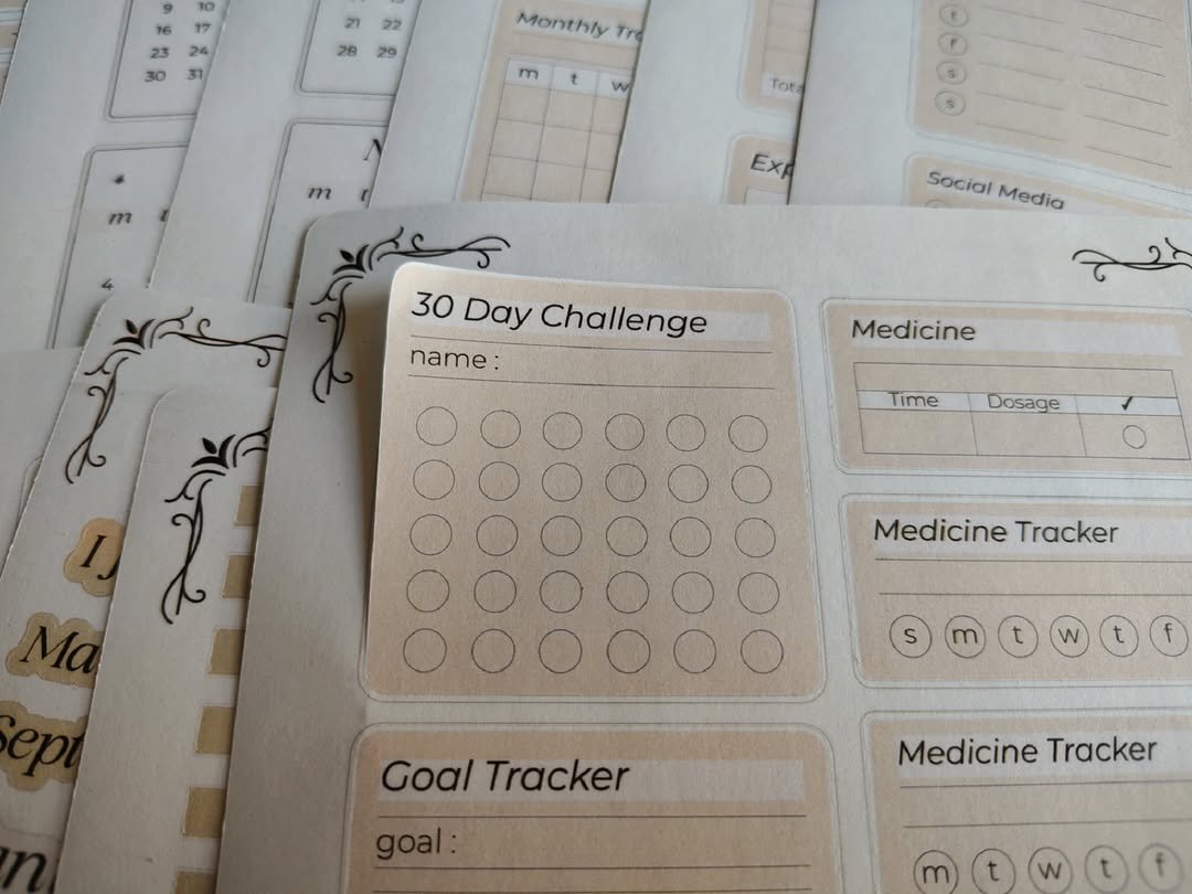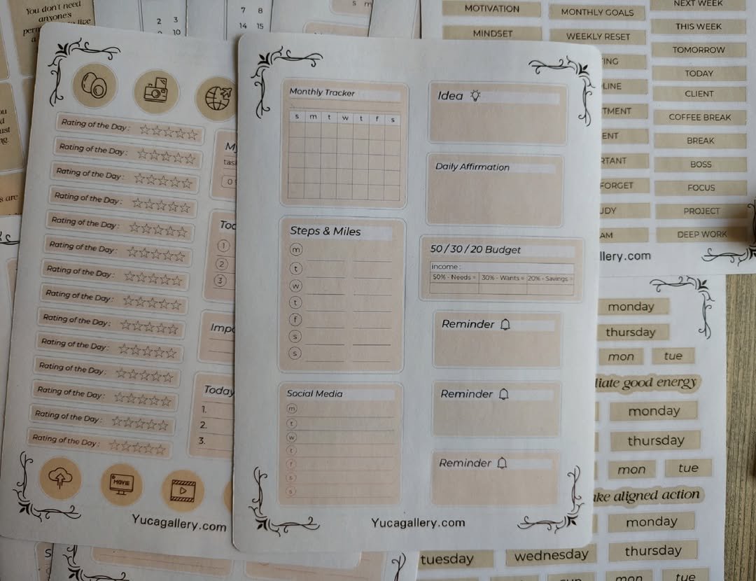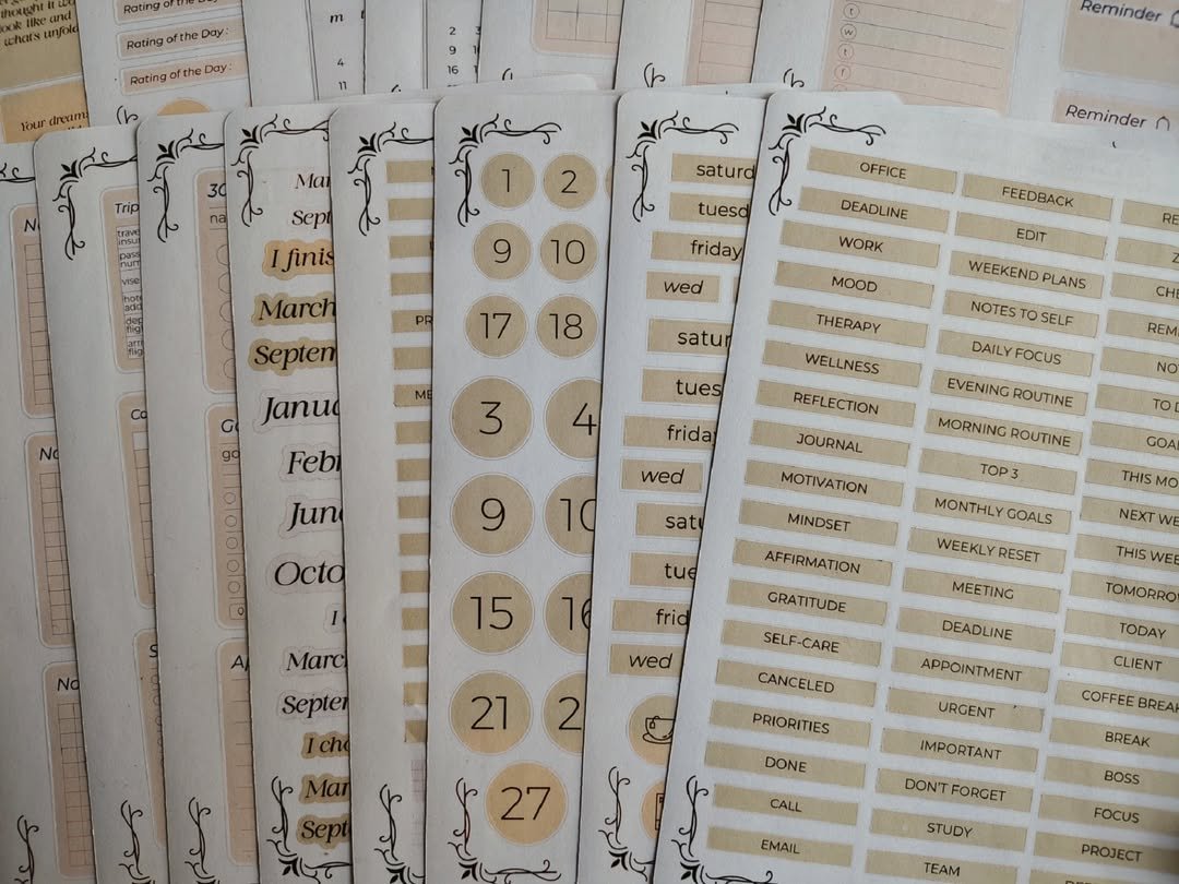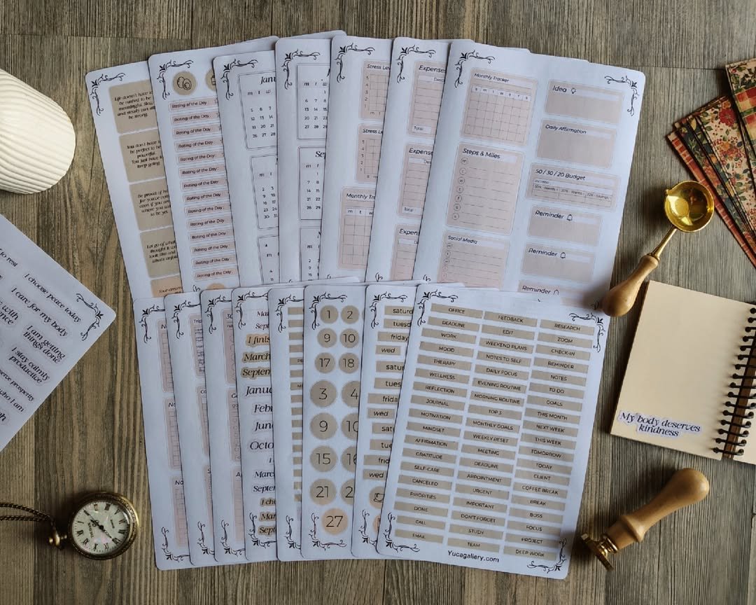 تشمل تواريخ، أيام، عناوين، تراكير، تودو ليست، تذكيرات وكلمات تنظيمية تساعدك تتابعي يومك ومهامك بسهولة وبشكل ممتع